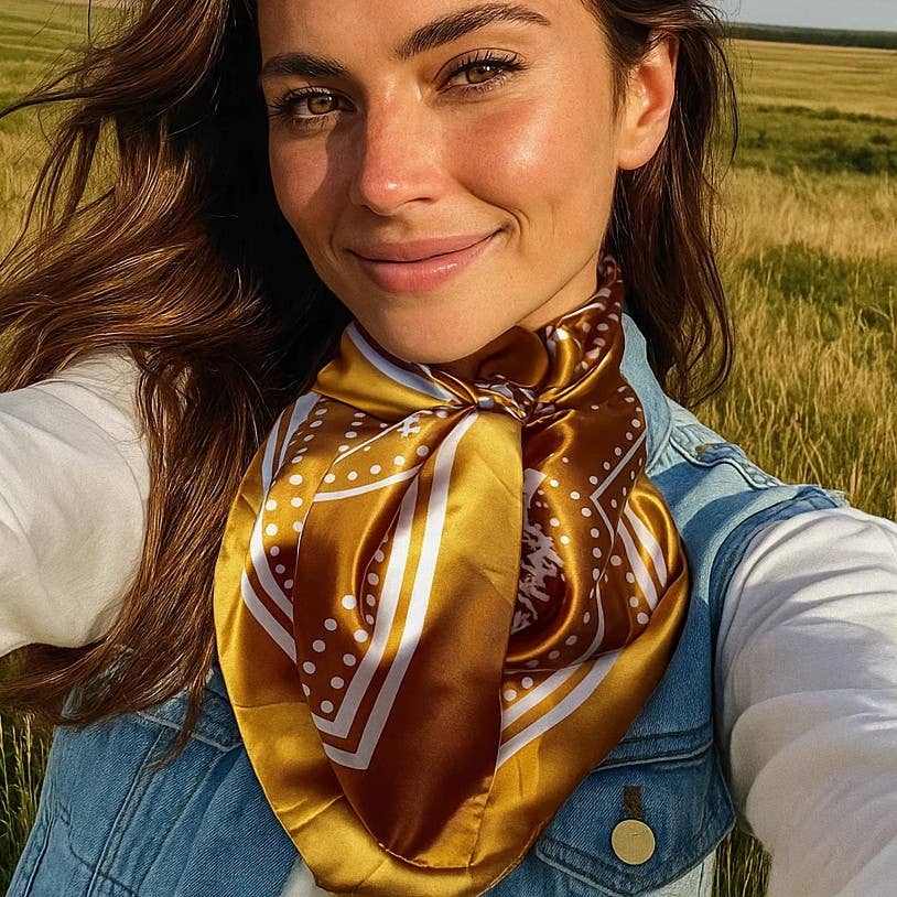 Our classic wild rag/scarf trimmed in mustard with a floral paisley pattern. It is a square and measures 35" x 35". It is sure to add a bright pop of color to any outfit.