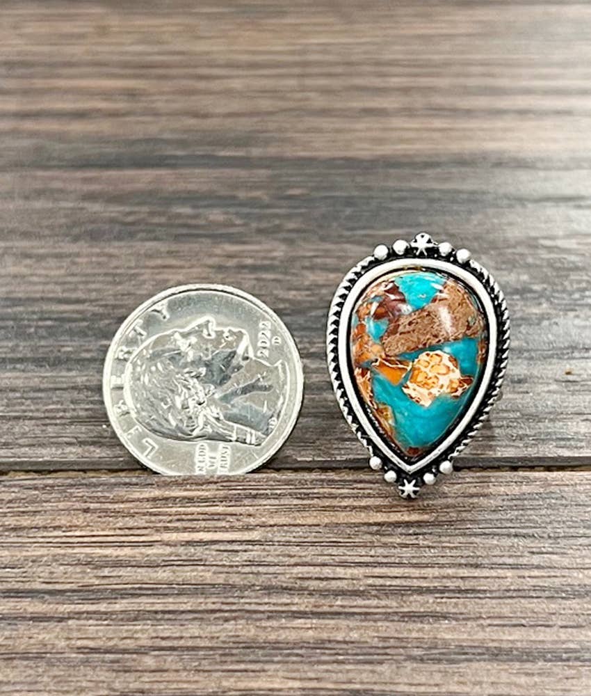 1.2" Long, Drop Gemstone Ring, Brass Dual Adjustable Band * Adjustable by expanding only both bands, not gemstone * Natural stone may vary in size, color or shape * One size, Adjustable by pull/push brass dual band * 1.2" ring on alloy metal, antique silver plate * 10 grams weight * Nickel, Lead & Chrome free