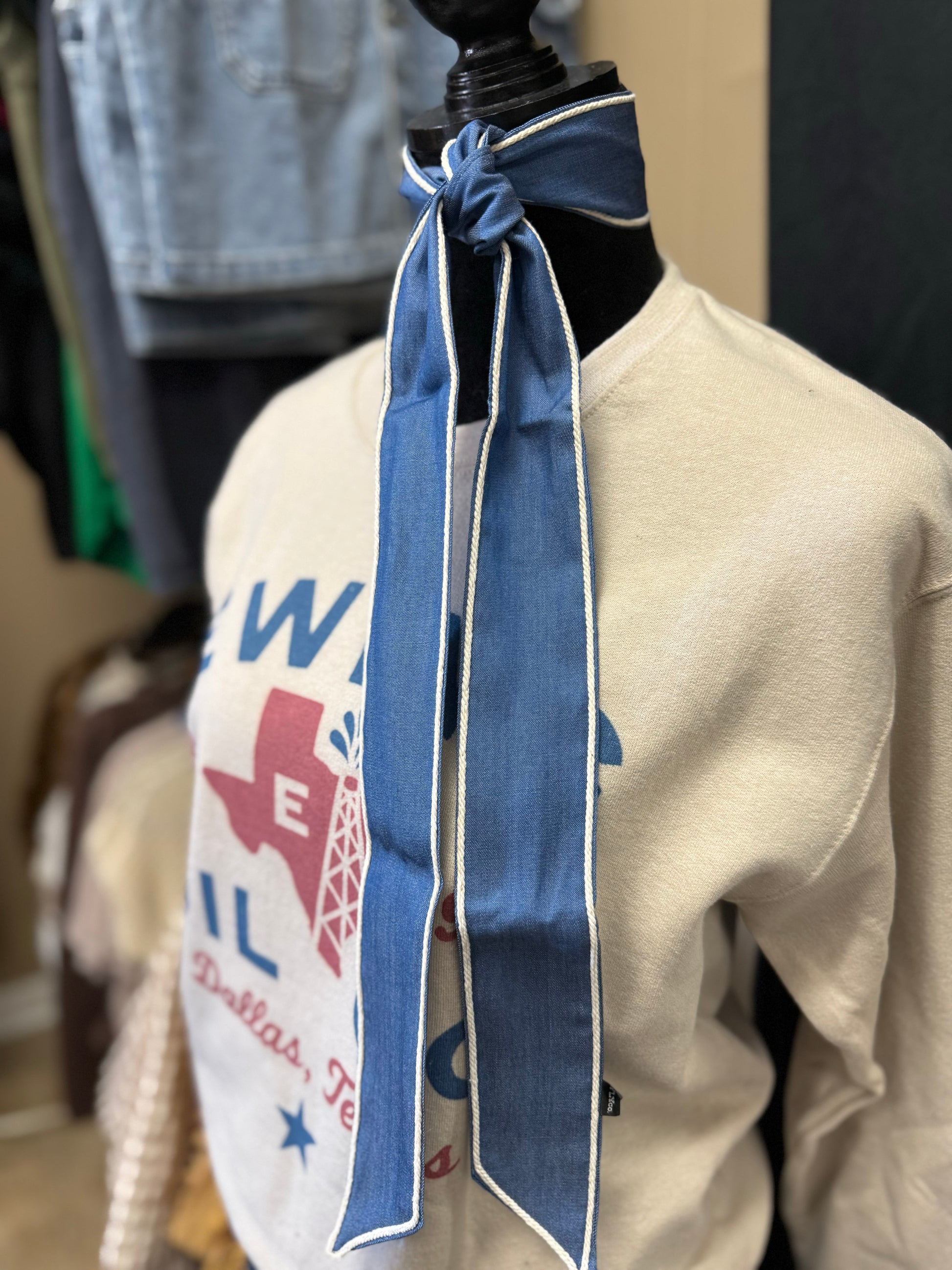 Soft, timeless, and effortlessly charming, the Bluebell Bow Twilly features a dreamy denim-blue hue finished with delicate contrast edging for a polished touch. Designed to be styled your way, this lightweight twilly can be tied at the neck, wrapped around a ponytail, or knotted onto your favorite bag for a subtle pop of color. With its nod to classic Americana and sweet feminine flair, the Bluebell Bow Twilly is the perfect finishing detail for everyday looks and dressed-up moments alike.