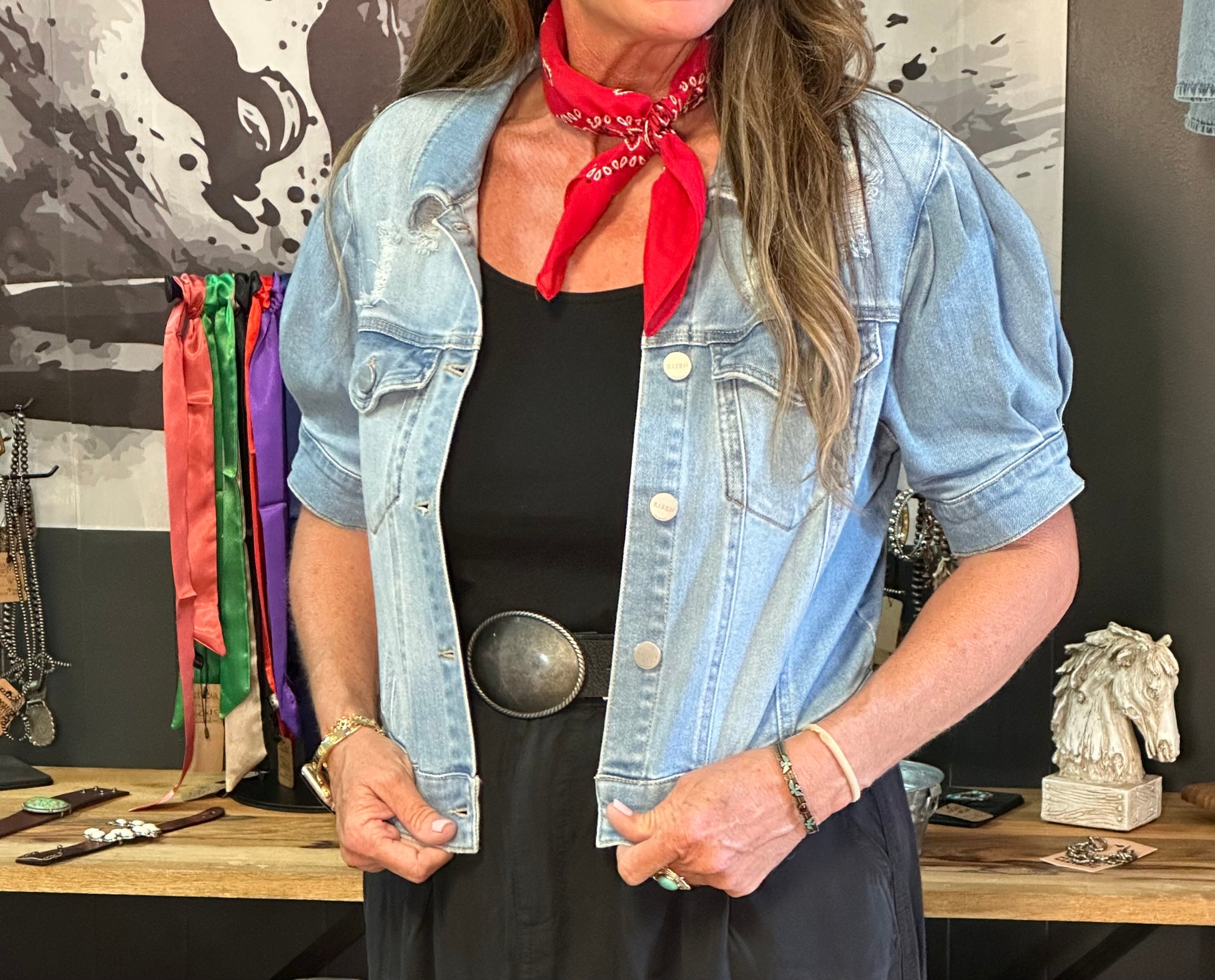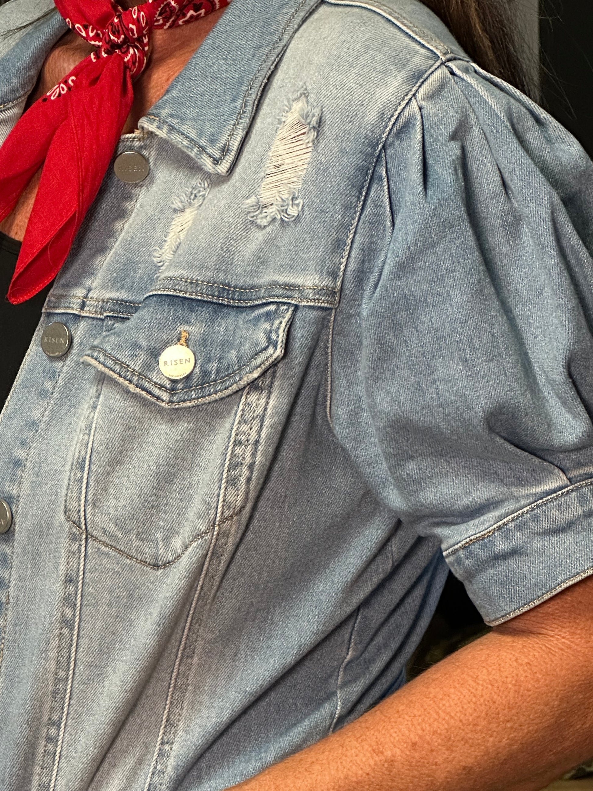 Bring a playful western spirit to your wardrobe with the Bluebonnet Denim shirring puff short sleeve crop jacket. Its puffed sleeves and shirred detailing add a flirty texture, while the distressed finish gives it that classic rugged western edge. Perfect for layering over your favorite tees or dresses, this cropped jacket adds a lively, worn-in charm that’s ready for any adventure.