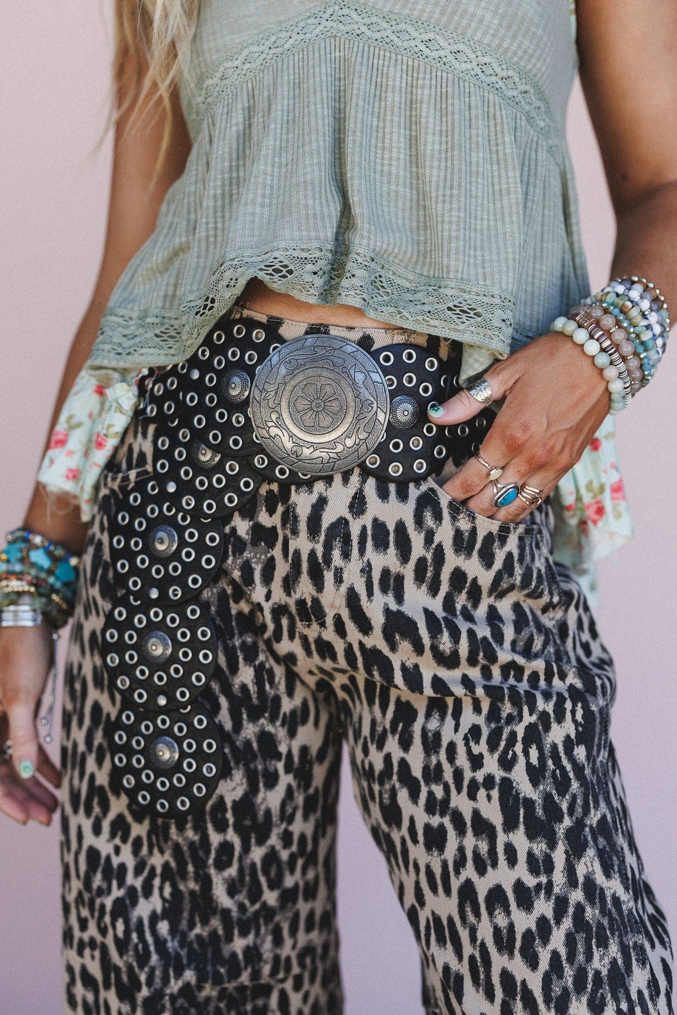 Turn heads with this silver and leather belt that looks perfect with flowy maxi dresses and skirts.