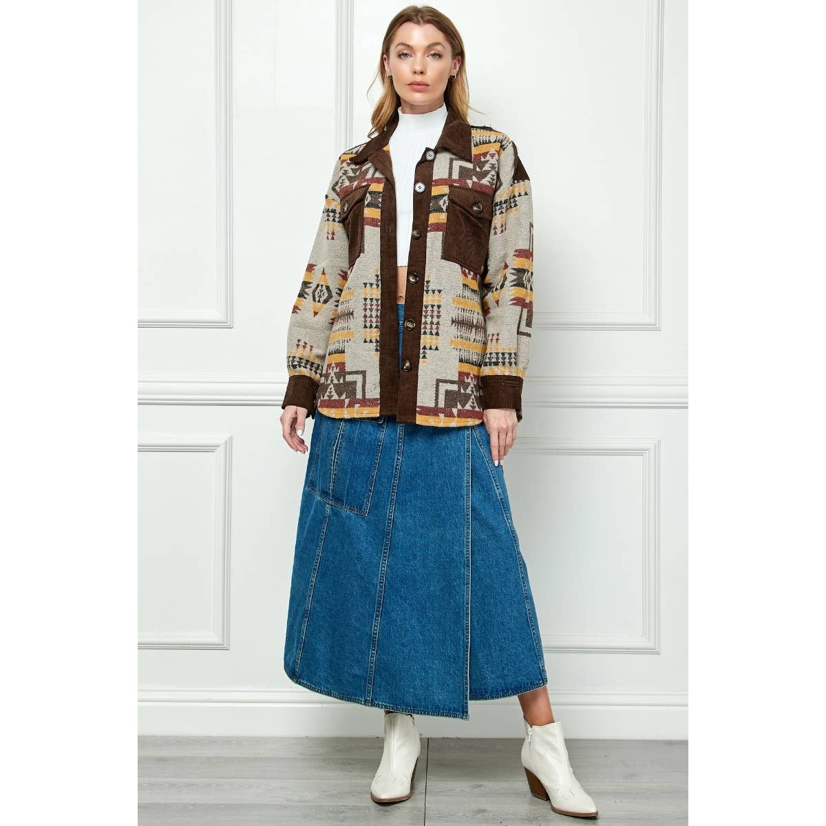 Cozy up in rustic style with the Campfire Corduroy Shacket, a warm and wonderfully textured layer inspired by nights under open skies. This standout piece blends a soft Southwestern-patterned knit with rich corduroy trim along the collar, placket, pockets, and cuffs, giving it that perfect balance of earthy charm and everyday comfort.