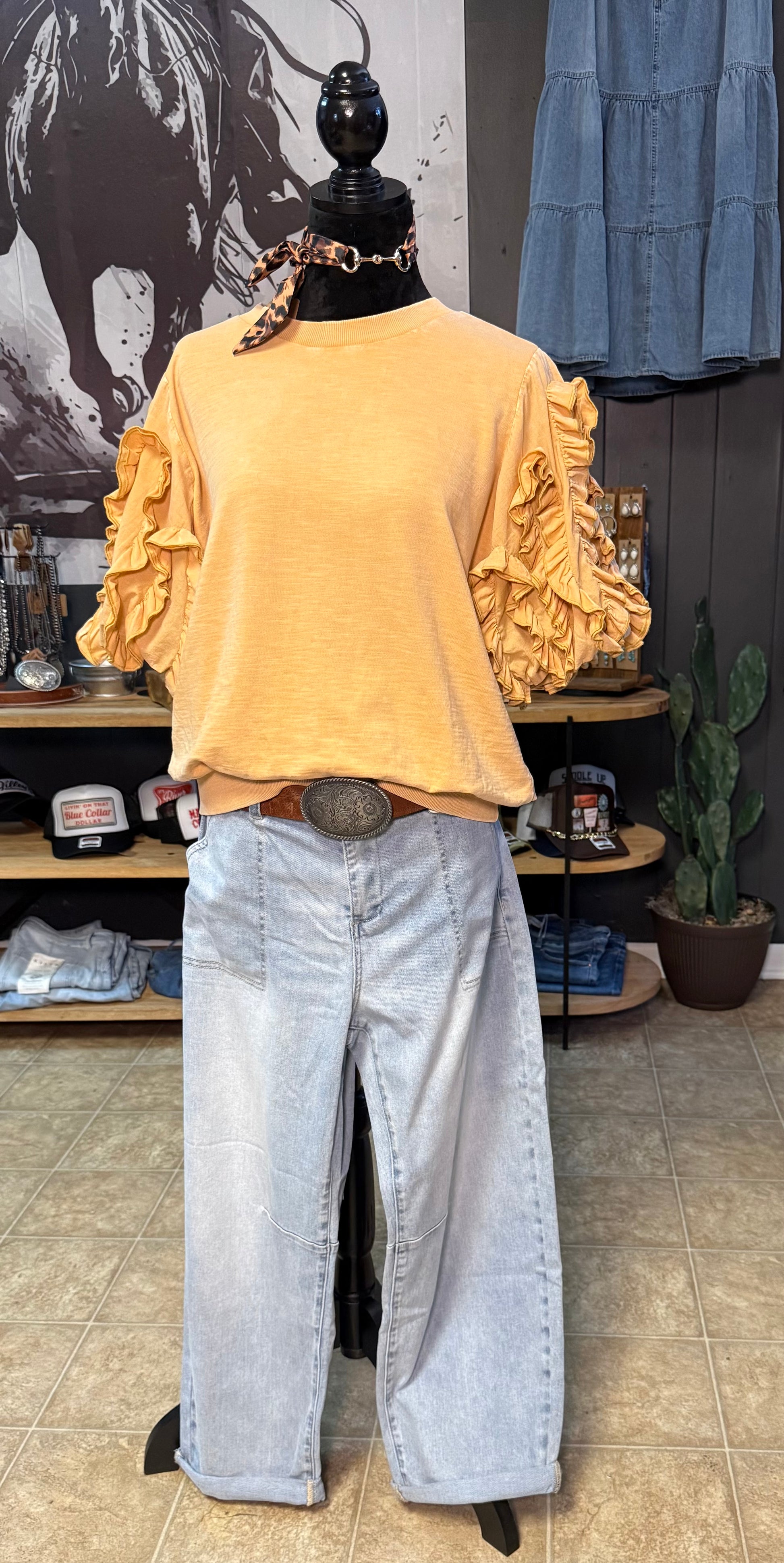 Add a playful twist to your wardrobe with the Cowgirl Gold Rush Top. Featuring bubble sleeves with layered ruffle detail, this top brings fun movement and a touch of western charm. Available in sizes S to L, it’s perfect for dancing, casual outings, or making a statement wherever you go. Embrace your inner cowgirl with style that’s as bold as gold!