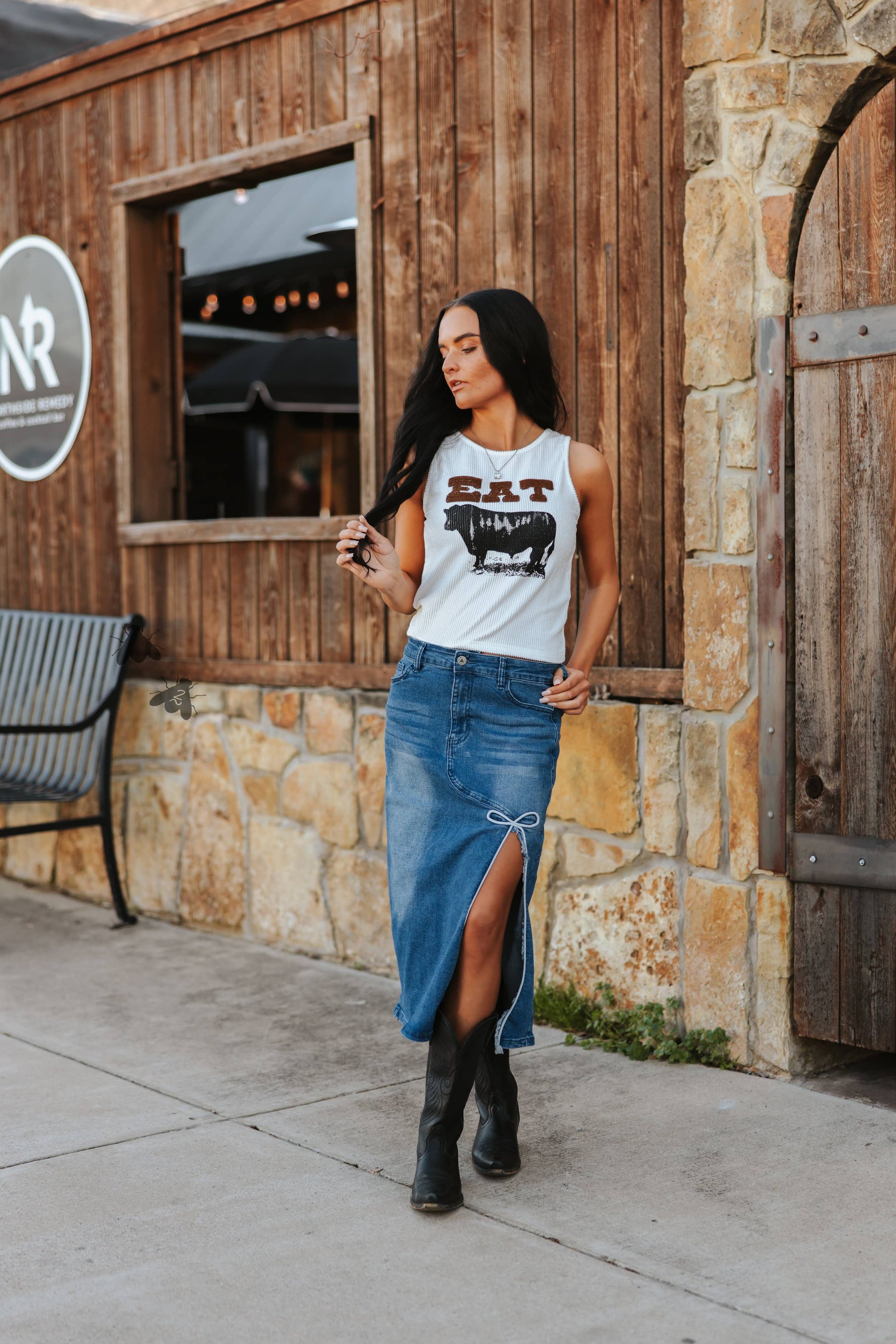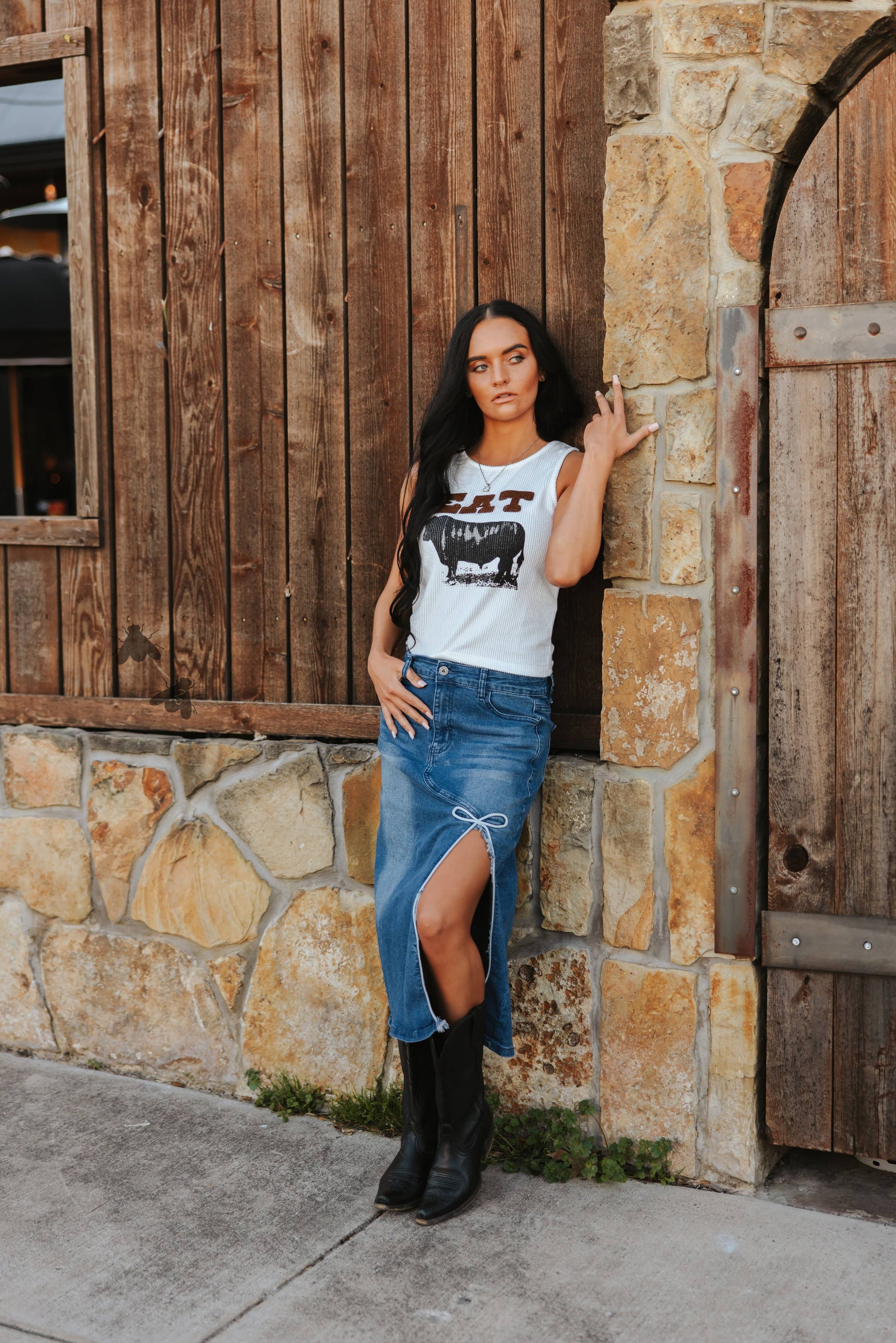 Step into style with the Denim Dreams long skirt, featuring a chic side split and a sparkling embellished bow detail. Perfect for pairing with a casual tee or dressing up with a blouse, this skirt effortlessly blends comfort and flair for any occasion. Let your outfit shine with a playful twist!