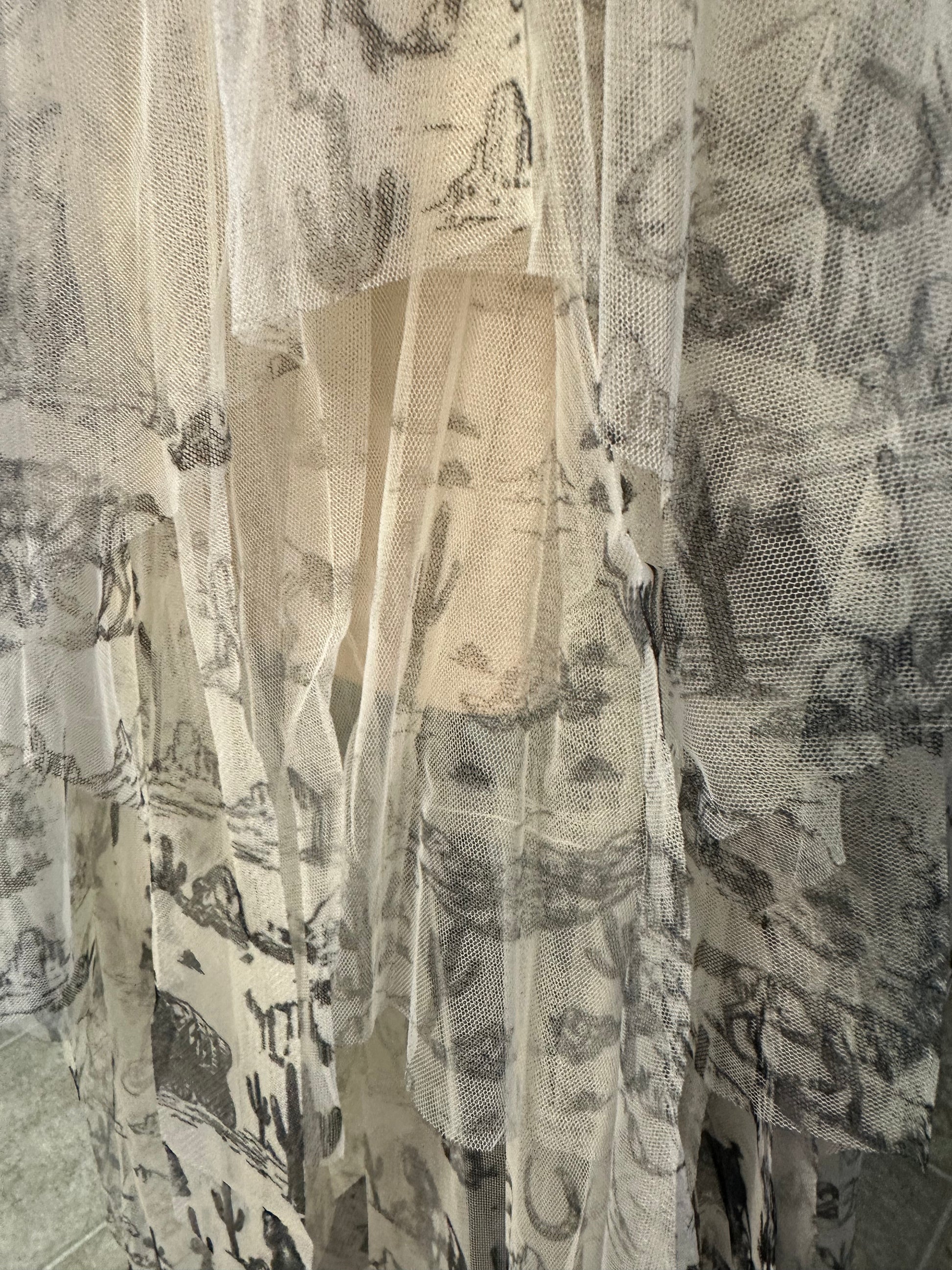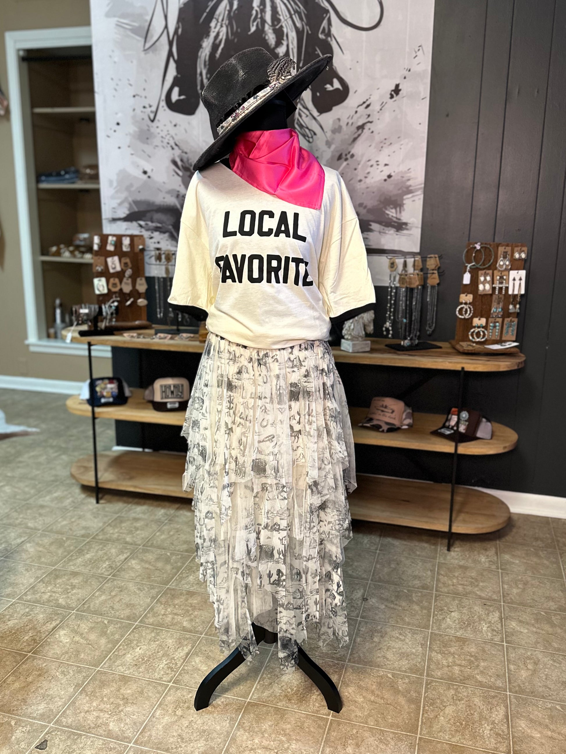 Want to make a statement... here is your chance! This skirt screams "let's have fun!" It has an Old West print on it and is lined to right above the knee. Pair it with a graphic tee or tank, boots or booties, and top it off with a Southern Yankee Hat! Perfect outfit!