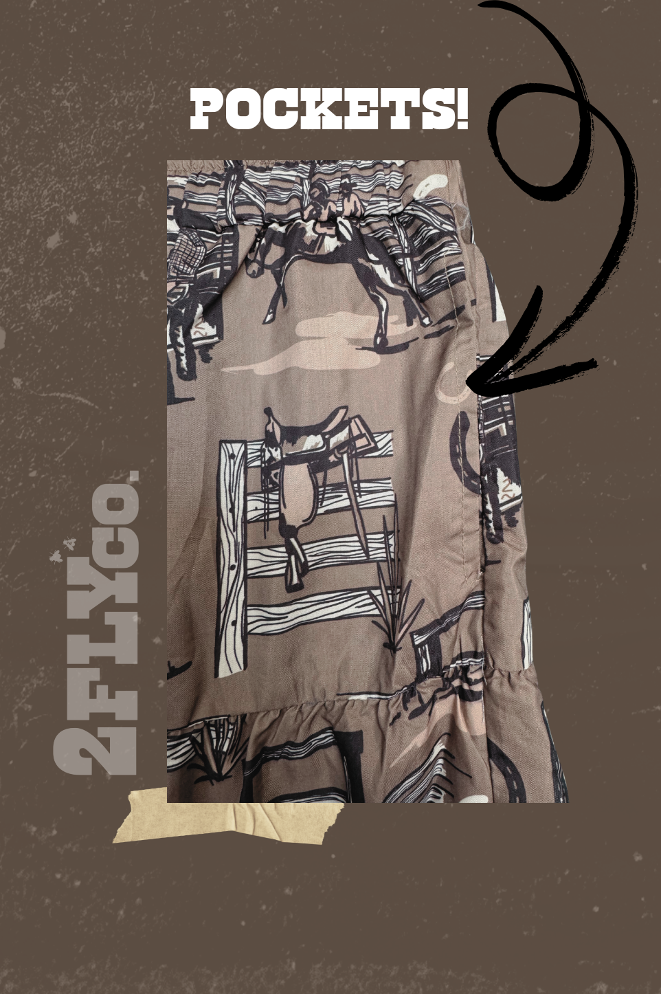 Celebrate ranch life with the Homestead Skirt, featuring playful graphics of cows, horses, and all things homestead. Made from a cozy blend of 60% cotton and 40% polyester, it offers comfort and durability for your everyday adventures. Available in sizes S/M, L/XL, and 2X/3X, this skirt brings rustic charm and a fun, spirited vibe to your wardrobe. Perfect for anyone who loves the ranch lifestyle with a touch of whimsy. Model is wearing a size L/XL