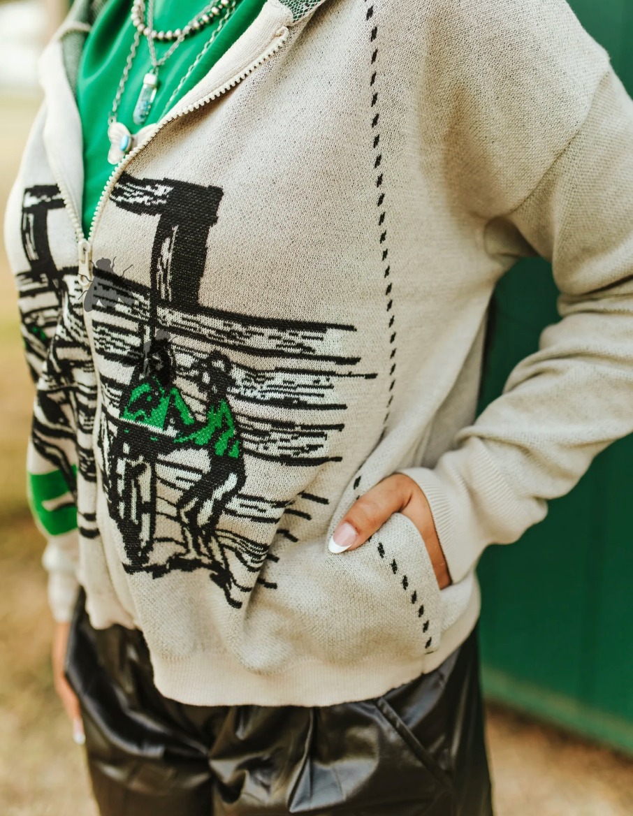The Ranchita *Verde is a cozy zip-knit jacket with a hood, featuring a charming western scene knitted right in. This playful jacket adds a touch of rustic fun to your look while keeping you warm and comfy. Perfect for adventures big and small, it’s your new go-to for cozy style with a dash of cowboy spirit.