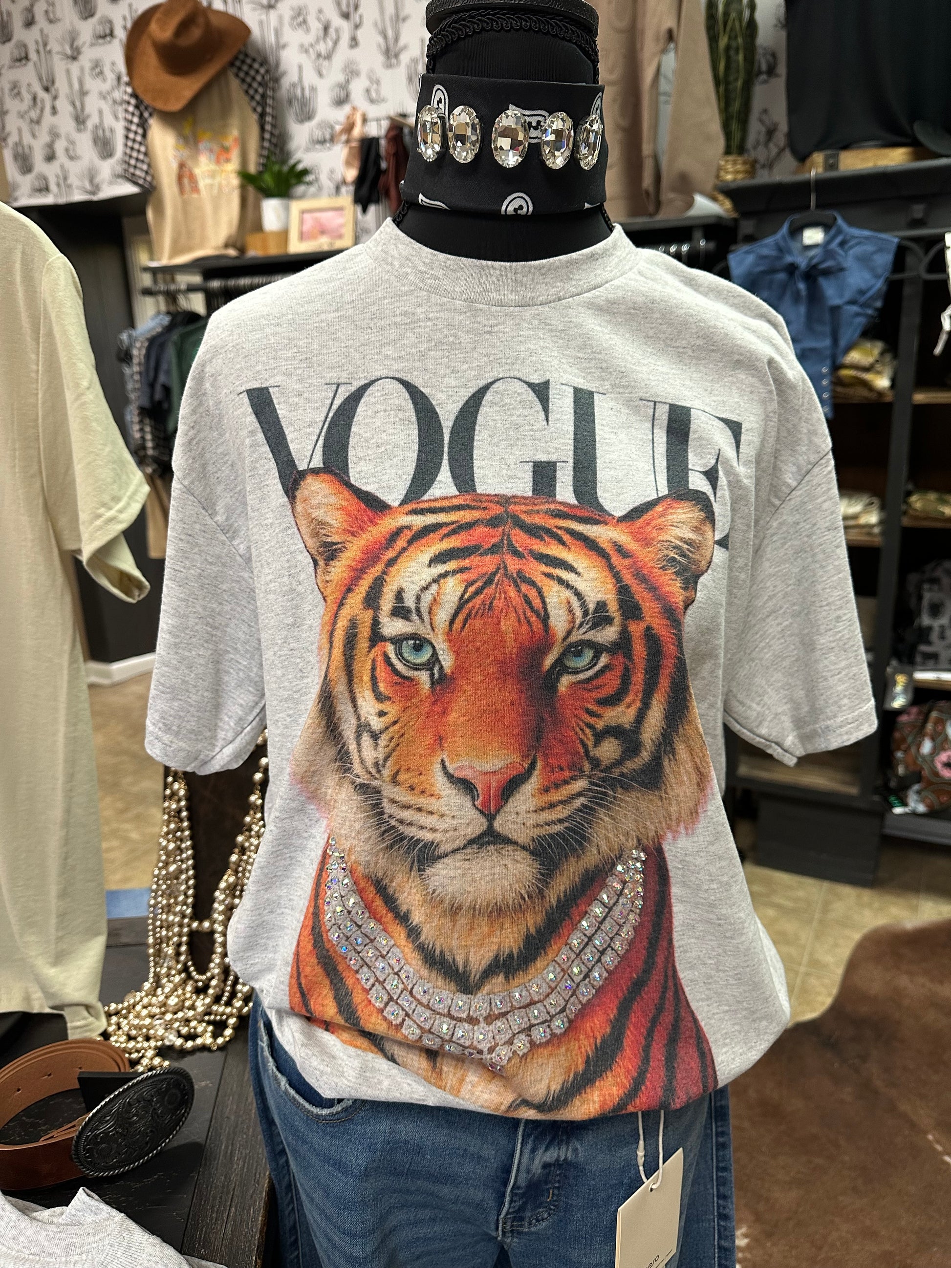 Bold meets glam in the Glitz & Growl VOGUE Tee. Featuring a fierce tiger graphic layered with iconic VOGUE-inspired lettering and sparkling rhinestone details, this statement tee brings runway vibes with a western edge.