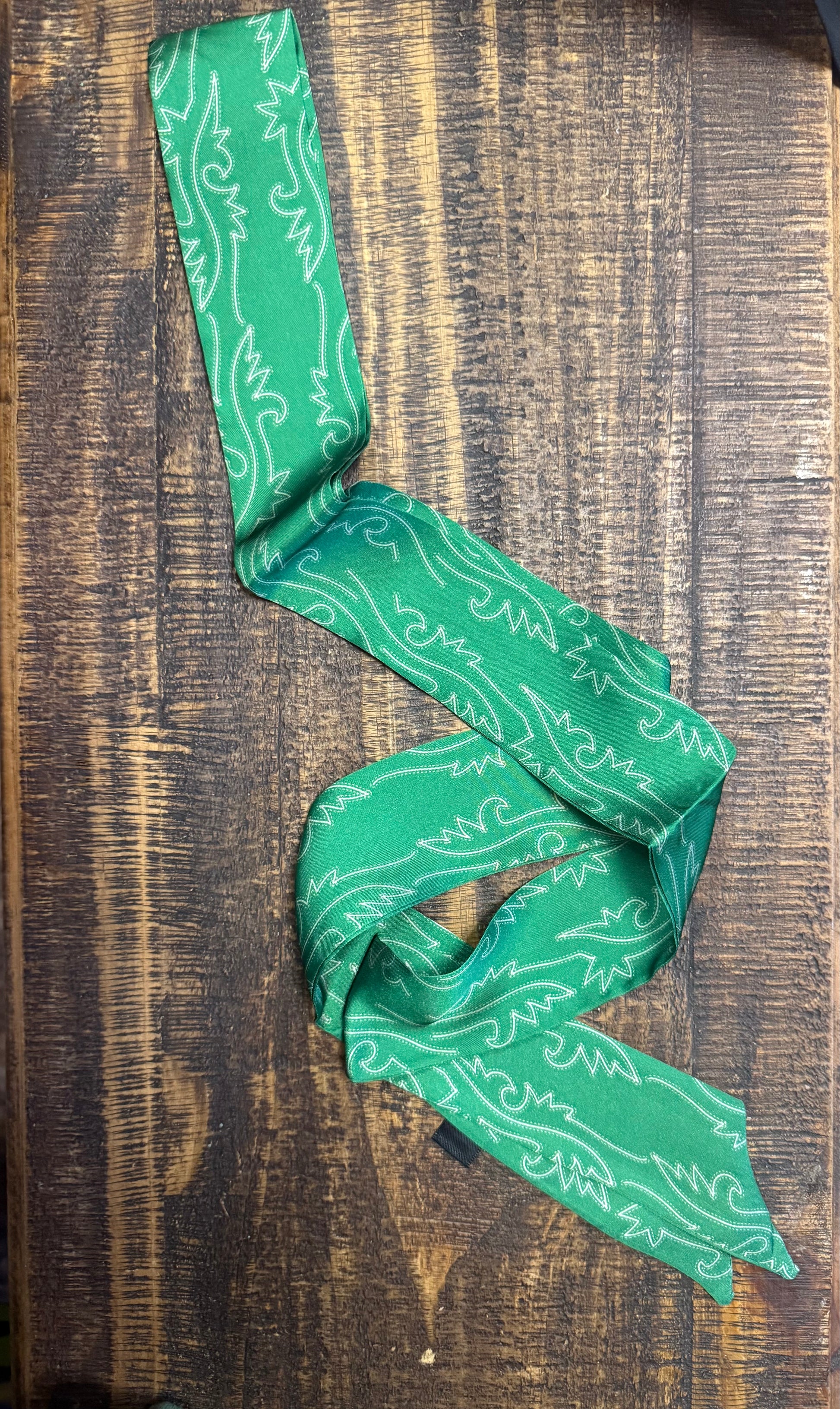 Transform your wardrobe with this must-have twilly—a fall and winter essential that's as versatile as your imagination. Weave it through your hair for preppy charm, knot it around your collared shirt, or give your favorite handbag handles a chic Western twist. Measuring 55 inches long and 2 inches wide, this 100% polyester accessory is lightweight and ready for anything. Mix, match, and reinvent—there's genuinely no wrong way to style it. Let your creativity run wild and make this twilly uniquely yours. 3 colors/styles available- Green with Gruene stitch, blue with horseshoes, and solid black