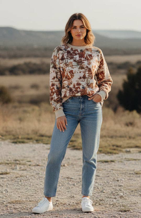 Description: This lightweight crewneck sweatshirt features an all-over western-inspired print with cowboys, horses, and desert scenery. Made from a soft sweatshirt knit, it’s designed for easy layering with a relaxed, casual feel. Finished with ribbed trim at the neckline, cuffs, and hem. Specifications: Fit: Relaxed fit. Graphics: All-over western cowboy print. Color: Cream base with brown and muted earth-tone print. Fabric: Cotton / polyester lightweight sweatshirt knit. Sizing: XXS/XS , S/M , L/XL (1-3-3) Kim is wearing a L/XL