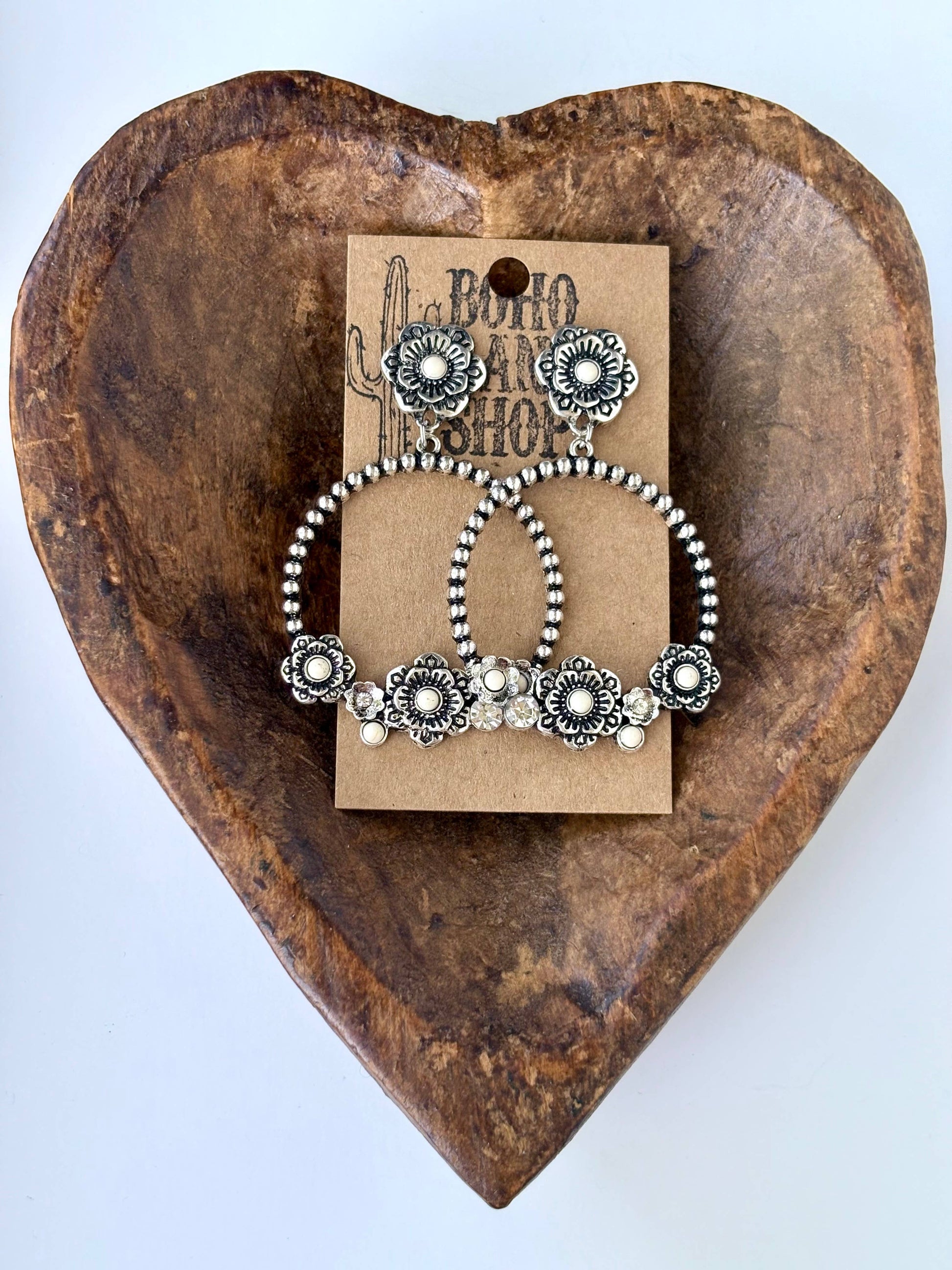 Western Style Flower w/ Stone Hoop Post Drop Earrings