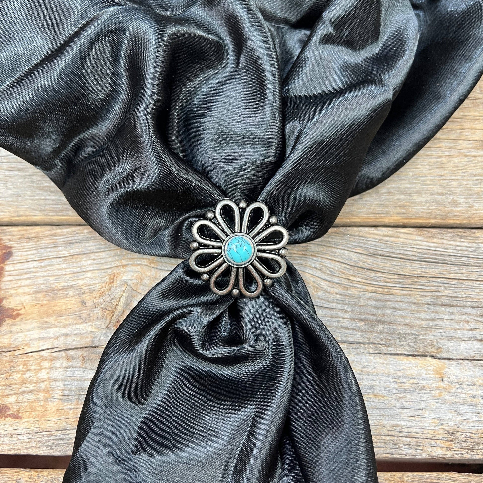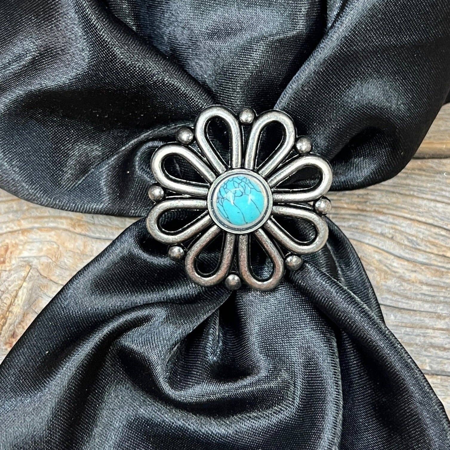 Antique Silver western concho with a flower design and turquoise colored center stone western concho slide (W231).